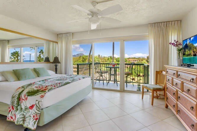 RARE Top floor (2 easy flights of stairs) 1 bedroom, 1 bath condo with both POOL VIEW and OCEAN VIEW. Adjacent to 20 ACRE Prince Kuhio Park (deeded into perpetuity to the Royal Order of Hawaiians as a PARK). This amazing location was the birthplace of Prince Kuhio, the "People's Prince". World Class Surfing (summer break May - Oct), Snorkeling and Boogie Boarding are directly across the street. Koi Pond with Waterfall, and mature Tropical Landscape make Prince Kuhio a special place. Fully furnished as a successful vacation rental. Ceramic tile floors throughout, King sized bed in Primary, with Custom Queen sized Murphy Bed in Living Room, and stacking washer & dryer. Live in this great location, run a successful vacation rental, or BOTH. Don't let this one get away from you!