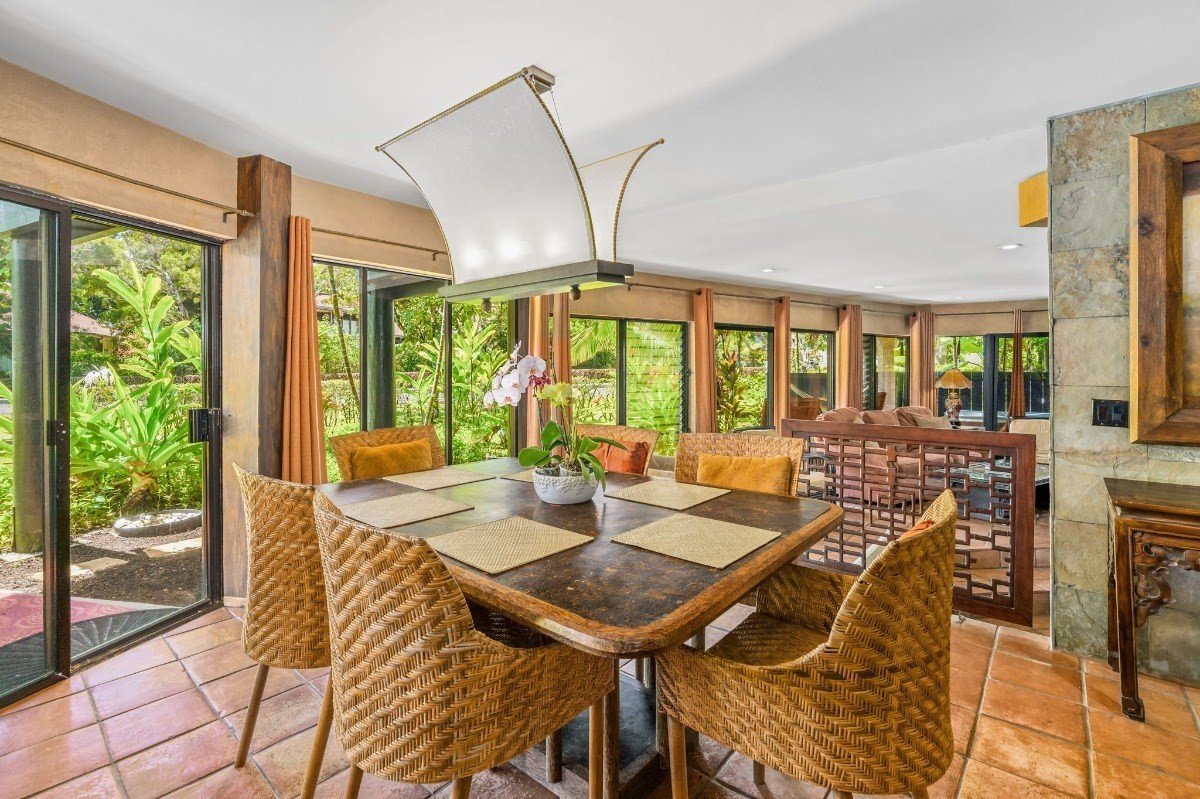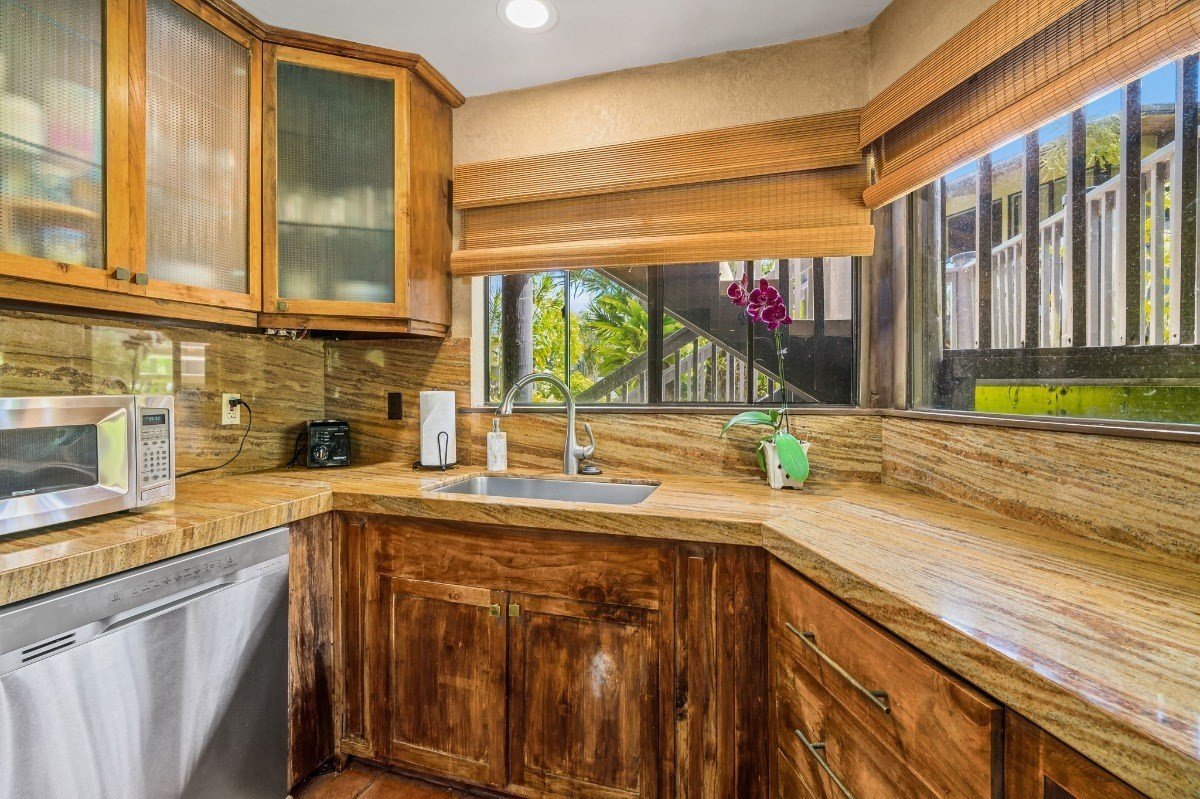 Beautifully hand carved hardwoods accent this Balinese inspired interior. From the beautiful custom kitchen cabinets, solid teak doors, hand carved accents in the bathrooms, and gorgeous granite counter top in the kitchen. The feeling of zen surrounds you. The main bedroom has a jacuzzi just out on the lanai for soaking after a fun day of Kaua'i play.