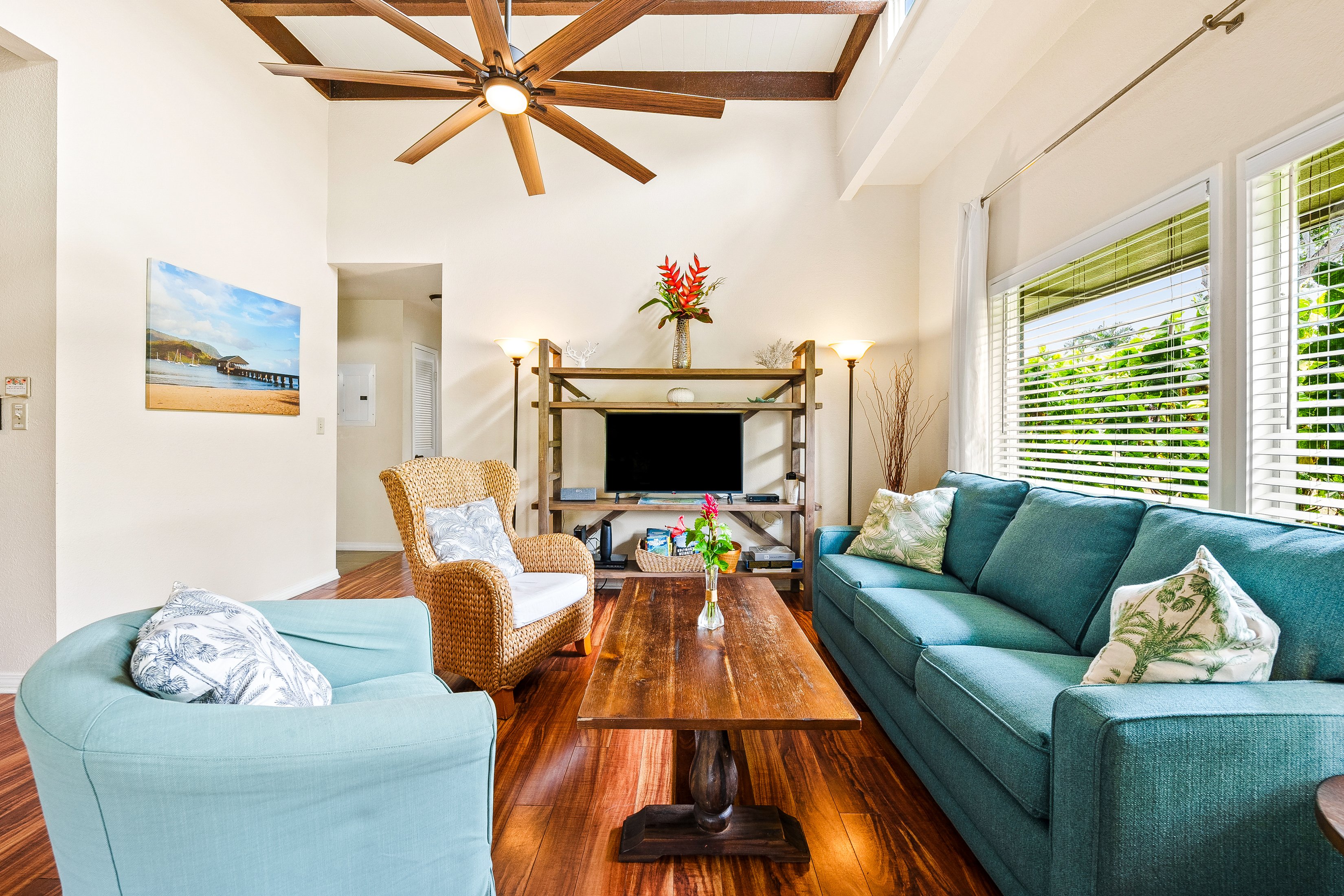 Priced to Sell! Light-filled end unit surrounded by private gardens at Puamana! #26A is an ideal, single story floor plan with soaring ceilings and luxury finishes. Enjoy morning coffee or afternoon Mai Tai’s on either of the two covered lanais.This two-bedroom townhome offers a comfortable living room with a lovely open beam ceiling, large picture windows, and a slider opening up on a private garden lanai. The spacious kitchen connects seamlessly with the dining area and features quartz counter tops and upgraded recessed lighting.The large primary suite has its own renovated en-suite bathroom, a walk-in closet, and a private lanai. The guest bedroom and bath also offer privacy and tropical views. Take advantage of full-size laundry and additional exterior storage space perfect for storing surf boards and other beach gear.Ideally located in the center of the complex, close to amenities. Take a dip in the pool after a day in the sun. Delight in fresh flowers from Puamana’s private cutting garden. Stroll across to the golf course, the perfect place to catch the sunset! Puamana is also located near restaurants & bars, shopping, secluded beaches, the Makai Golf Course, and just a short drive to world-renowned Hanalei Bay.Beautifully decorated, #26A is being offered fully furnished including new living room and lanai furniture, plus a brand new washer and dryer. Sold turn-key as an established vacation rental, nothing to do but relax and enjoy!
