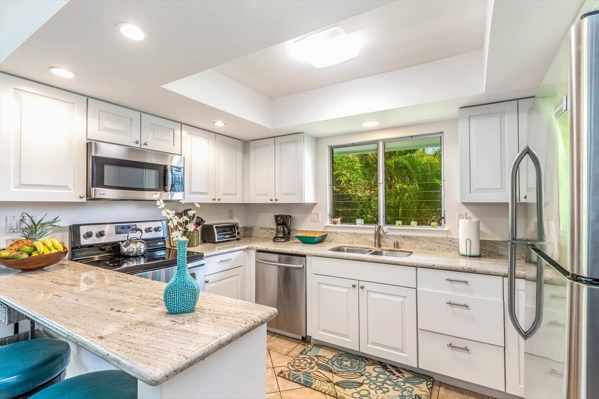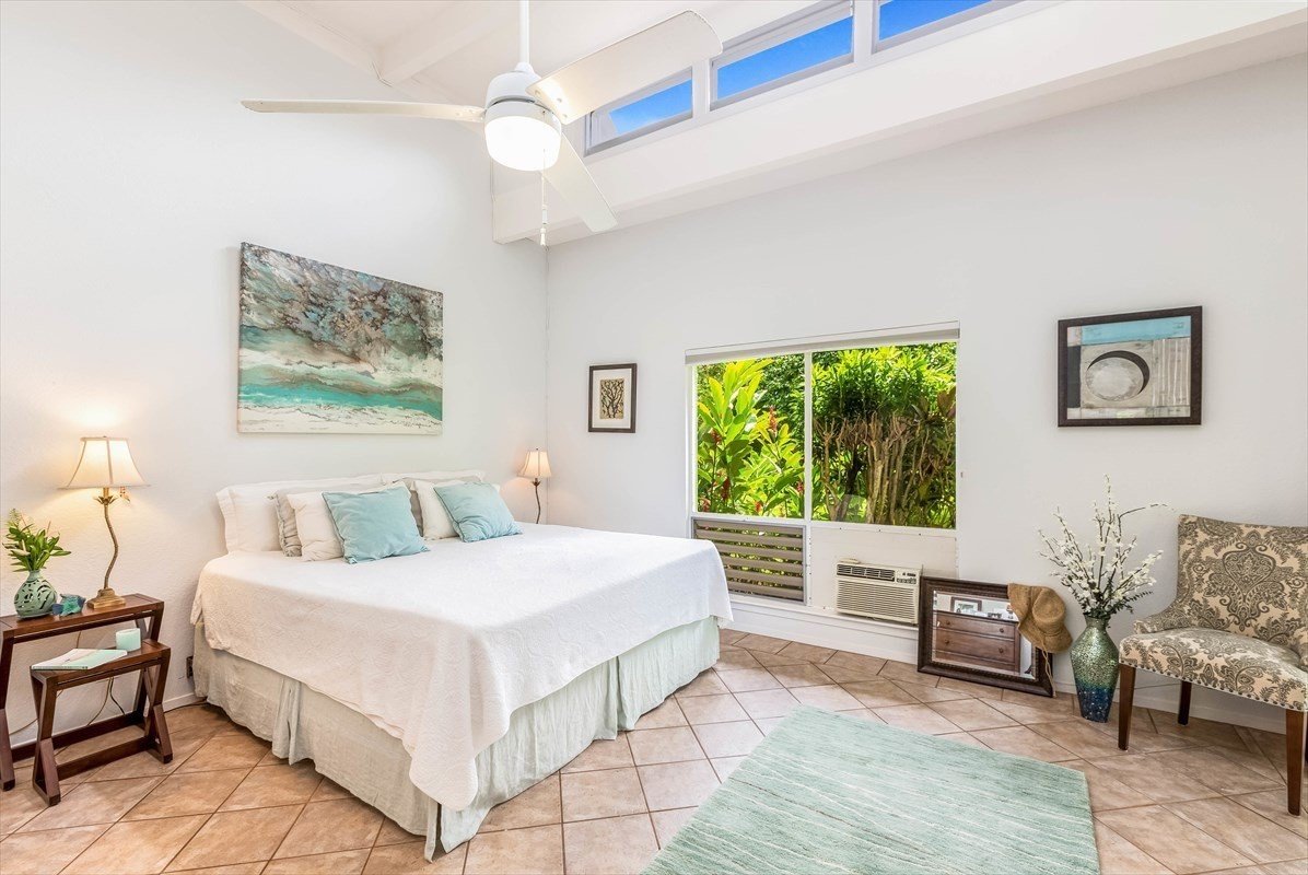 Puamana in Princeville, almost 10 acres of lush landscaped grounds perched on the bluff over Anini Reef. There are fruit trees, tropical flowers and a cutting garden for your use and enjoyment. The community pool features a lovely clubhouse with remodeld bathrooms and newer outdoor furniture. A shaded tree canopy trail is a 10 minute walk down to Anini Beach which is on the largest lagoon in Hawaii. The Westin, public library, shopping and medical facilities are minutes away. This private end unit is a stylish single story floor plan featuring very high volume ceilings, tremendous natural light with favorable tradewind airflow. In addition there are two separate outside, ground level lanais for some personal outdoor space perfect for dining and potted gardening. There is designated parking steps from the front door and a large outside storage closet. The kitchen is updated and there is tile flooring through out. Make this your special island oasis with the option to vacation or long term rent. Princeville is a very desired and accessable Island destination, just a 10 min drive down the hill to famous Hanalei Bay with breathtaking mountain views and pristine cresent beach.