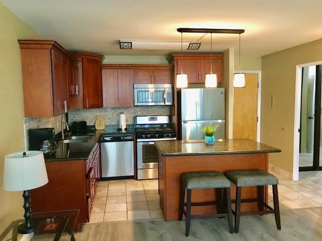 1 bed, 1 bath remodeled condo with granite counters, brand new stainless steel refrigerator, gas stove and wood laminate flooring. The condo has beautiful mountain and ocean views looking out towards the West Maui mountains. You can see right up into Iao valley. The bathroom has been remodeled with custom mirrored glass doors with wood trim. It is being sold furnished. There is one assigned parking stall. Puuone Terrace is a concrete building centrally located. Electric is included in the low monthly maintenance fee.