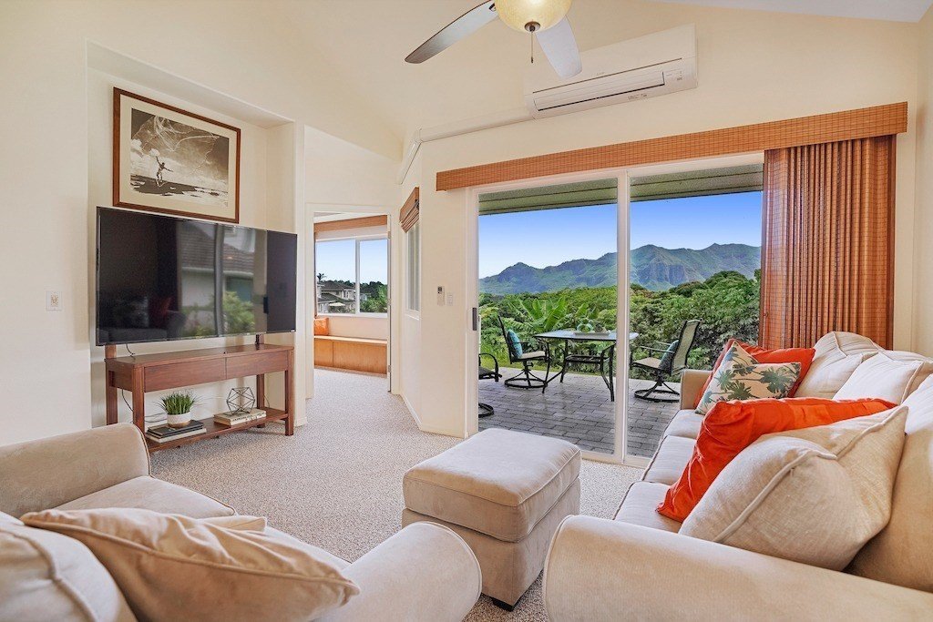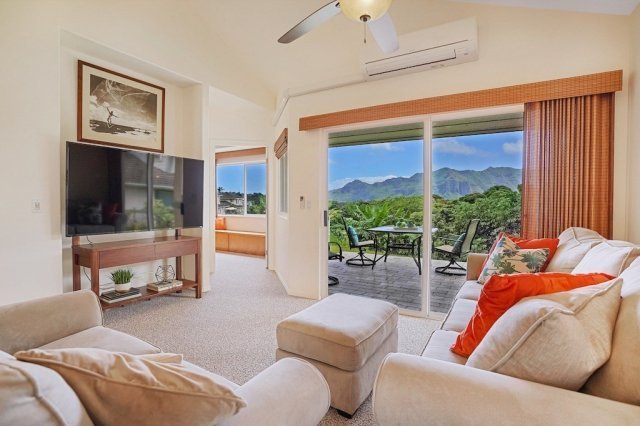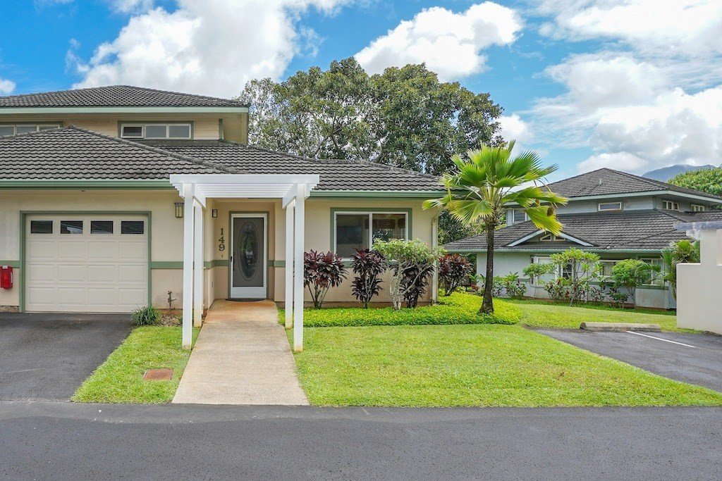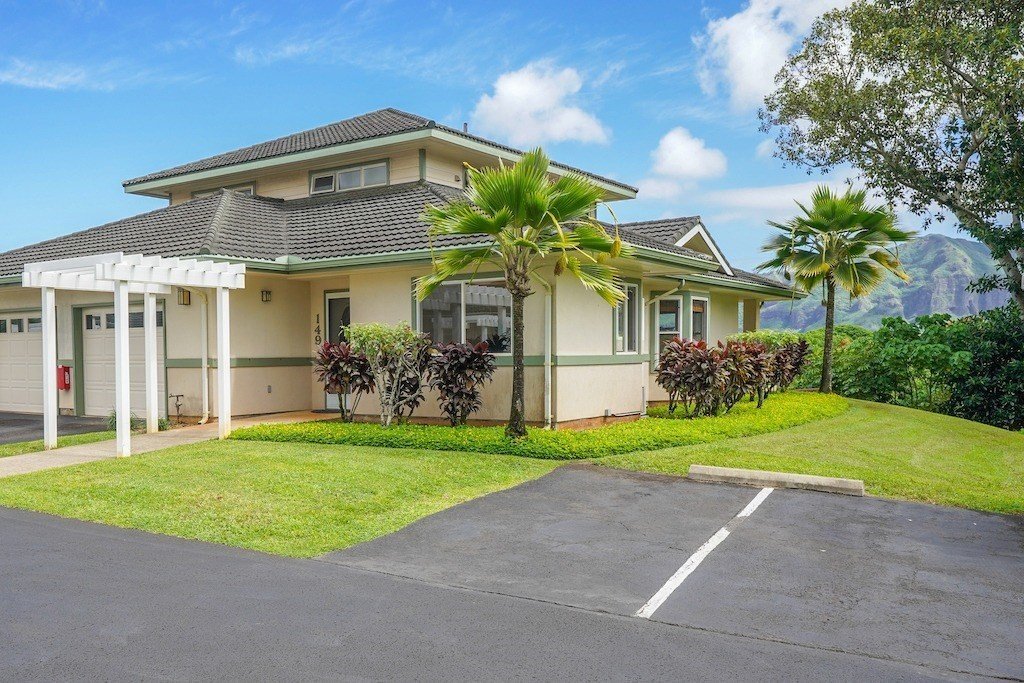 Rim Location & Mountain Views + Quality upgrades set this townhome apart. Regency Hule’ia is a centrally located premier residential condominium community in Lihue. This end unit on the upper rim of the project overlooks a lush tropical valley with great views of Haupu mountain range. For the buyer with discriminating taste who wants it easy, this 3 bedroom, 2 ½ bath townhome is newly upgraded and move-in ready, with most furnishings negotiable. It is light, bright and immaculately maintained, with room to spread out, and lives more like a single-family home. Cool off in the private community pool, enjoy tradewind breezes on the rear lanai or relax in the comfort of air-conditioning. The 15-acre complex has beautiful landscaped grounds, secure mailboxes, in-ground pool and plenty of parking for home owners and guests. All exterior maintenance is included in HOA fees.