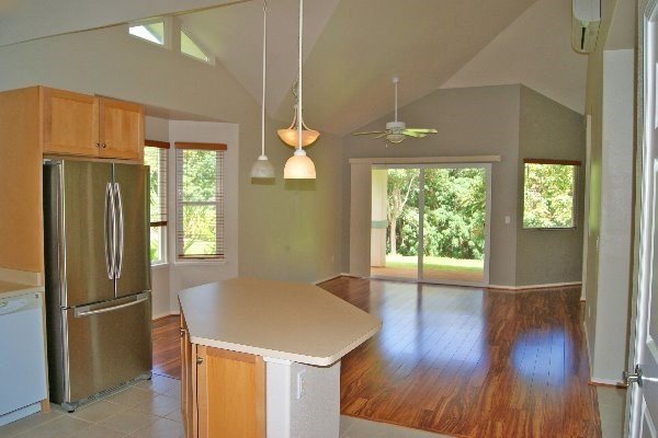 REGENCY HULEIA #161: super-clean, air-conditioned 2 bedroom townhome in convenient Lihue. It's RIM location and sparkling interior is sure to please. As soon as you open the high-end front door, you will feel the freshness and upgraded presentation of this quality property. Vaulted ceilings provide the spaciousness. 3 split system air conditioning, tradewind orientation, and ample ceiling fans keeps things cool for you. Open concept floorplan segues from tile flooring in the kitchen to newer rich wood laminate flooring in the living room. Ample windows found only in end units like this are completed with custom blinds in every room. Generous Master suite has a walk-in closet and mirrored door standard closet. Walk around bathroom has over-sized shower and the other bathroom is a half bath located by the kitchen. In addition to quality appliances in the kitchen, there is also a large walk-in pantry with shelving and a washer dryer closet. The second bedroom features a built in dresser / shelving in the mirrored door closet. Even a one car garage with storage! So much in this smart, single-story layout so that you will be comfortable living here for years to come.The desirable RIM location blesses you with privacy, and a natural greenbelt that makes you forget you are "in Town".Lihue has it all! Shopping, dining, churches, schools, Kauai Community College, theater, beach, golf, airport, hospital, and more.Regency Huleia is a peaceful, private complex with a pool and terrific people. Reasonable HOA fee keeps it this way. Easy to see today!