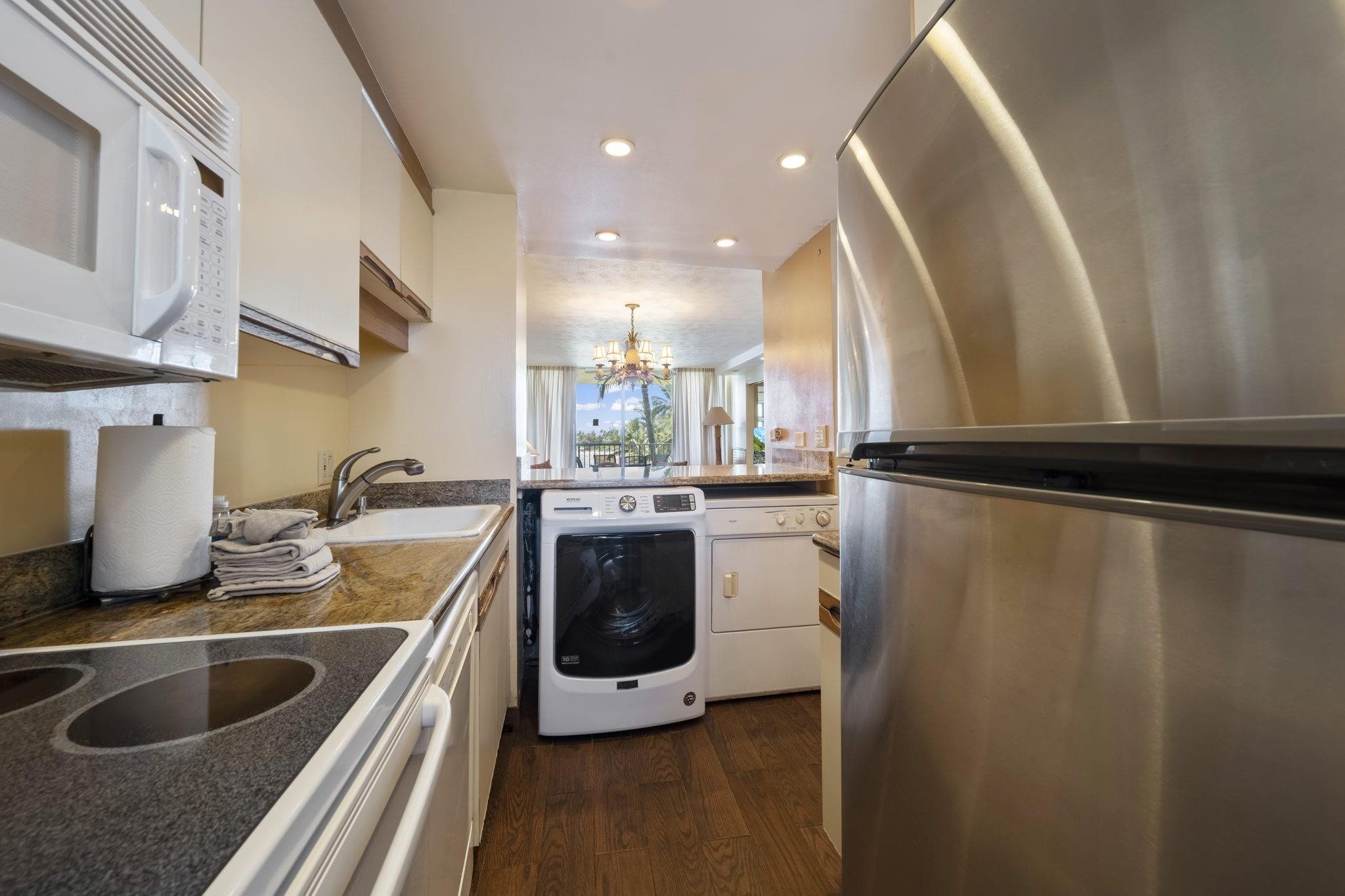 Gorgeous Ocean views right from your bed! This 2 bedroom 2 bathroom condo in Royal Mauian has a stunning view from both the main living space and the primary bedroom. Spacious Lanai, split AC, and washer dryer in the unit. Perfectly situated close to the Kamaole Beaches, as well as the Shopping and Restaurants on South Kihei Road. This vacation rentable complex also has a pool and a rooftop garden great for grilling and watching the sunset. What a great opportunity to own a condo right on the water. The unit is currently active in a vacation rental program and all future bookings must be honored.