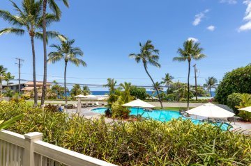 ROYAL SEA CLIFF - Two Bedrooms - Two Baths - 1,087 sf living area w/additional outdoor living space on the covered lanai - Ocean Horizon/Garden View Maintenance Fees Include: **Central AC Cooling system - just turn on your air handler (intake fan) within the unit, by setting the thermostat to the desired temperature, to bring the cool air in - saves you $$ on cooling your condo! Unlike running traditional AC, the intake fan is much more cost effective & keeps electric bills down. **Upkeep of the 2 oceanfront pools, hot tub, tennis court, landscaping, water features, BBQ grills, Exterior walkways, stairs & railings, etc. **Basic Cable TV, Wifi, Landline **Insurance for common areas - New easy-care wood-look vinyl laminate flooring 2023 - Updated kitchen cabinets with granite countertops - New A/C Air Handler installed July 2023 - a $15K upgrade - Natural Stone Tile Shower/Bath Surrounds in both bathrooms - Ceramic Tile Flooring in both Bathrooms - Open spacious living area - Sliders to the covered lanai from the living room & primary bedroom - Primary bedroom faces the ocean - Lockable owner's closet on the covered lanai & small owner storage inside - Turnkey furnished - all large pieces of furniture, kitchenware & small appliances will remain for the owners' convenience. The unit is partially staged w/art & decor items which will be removed prior to the Final Walk Through - Inventory of included/excluded items will be provided upon request - Oceanfront Complex - Concrete construction - Gated/Covered parking - 1 stall - Elevators from parking & throughout complex - easy access to common areas including pools - Central Air Conditioning System in the complex - Two oceanfront pools - one with hot tub - both have covered sitting areas - Tennis Court - BBQ Grills - Close to dining, shopping, entertainment, beaches - walk along Alii Drive or take a short drive to downtown Kona or to Keauhou