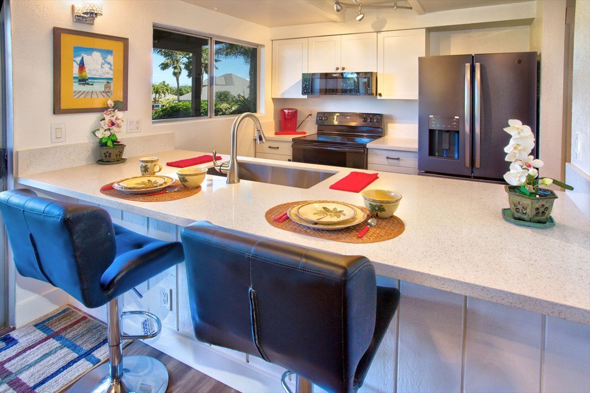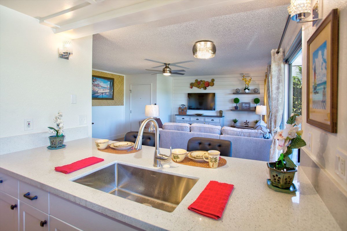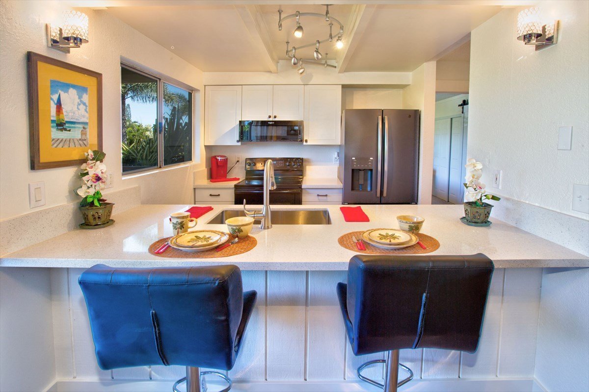 A truly special turnkey property on North Shore Kauai? does not come available very often. Now is that chance!! With Both A and B sides completely remodeled, no detail has been left untouched. An open, custom kitchen design with sparkling white quartz countertops, sets off the top of the line appliances and all new cabinets. Custom lighting, fans and hardware are not to be missed as they set the property above the rest. Both sides have instant income potential whether rented together or as 2 separate units... Yes DOUBLE the income!! This design is even made more valuable as the B side has an Uber convenient WASHER-DRYER COMBO upgrade!! WOWZA!! Never seen that before in Sandpiper!! Everything is new, new, new!! From the designer furniture to the crisp new ship-lap, paint, and much, much, more.. just enjoy!! This is the hottest condo on the market and will not last long!!! Mahalo