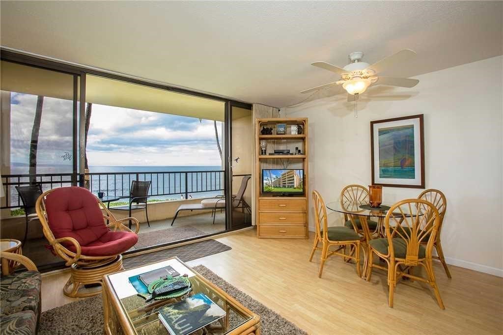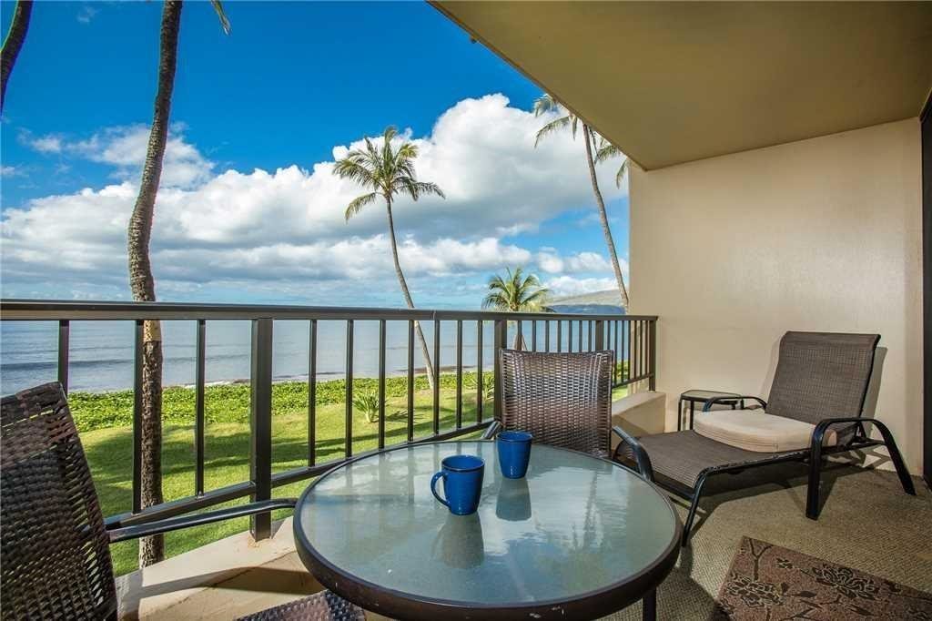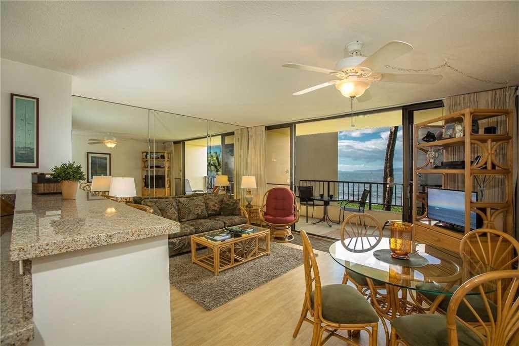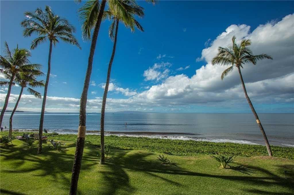 The soothing sounds of the ocean as it gently washes up onto the sand greet you from this delightful front row unit at Sugar Beach Sitting above the sand , the beach stretches before you to the right and left with the beautiful blue water directly in front of you. Molokini and Kahoolawe sit on the horizon to the left with the curve of the sand leading the eye to the West Maui mountains to the right. Remodeled in 2017 with granite in the kitchen and bath and new tile in the bath, this unit has easy care laminate oak floors in the living areas. Access from the upper level parking area removes stairs and elevators from your visit to the unit. The unit is a very busy vacation rental in the very popular Sugar Beach resort. The maintenance fees include electricity as the buildings have central AC. Other costs covered include basic cable, trash, water and sewer, insurance on the grounds and buildings and maintenance of the pool, common areas and buildings. Call your favorite realtor for a preview apt. Listor will work with management company to accommodate showings.