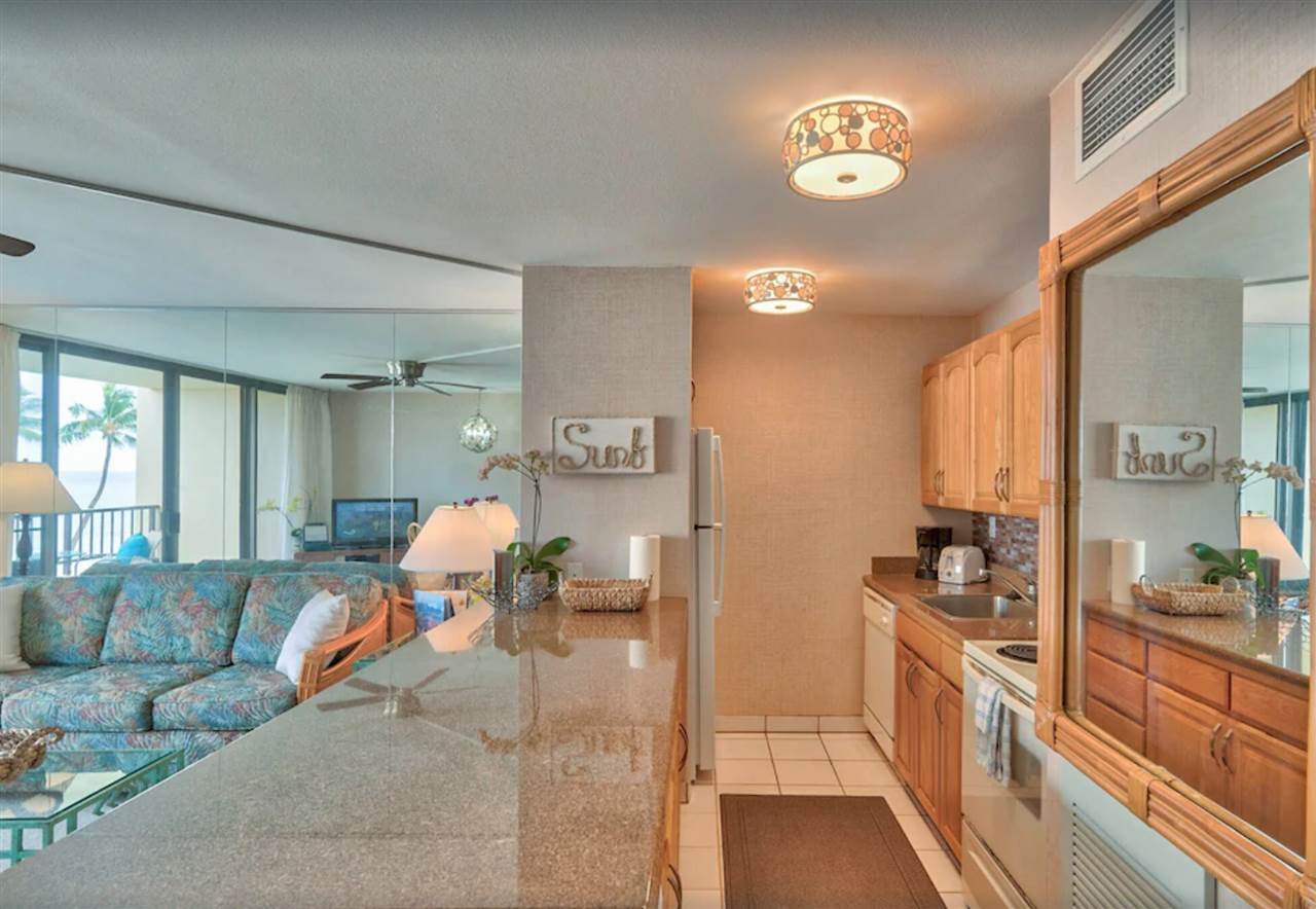 TOES IN THE SAND experience at Sugar Beach Resort. This is an oceanfront complex with all of the goodies- oceanfront pool, oceanfront hot tub, oceanfront dry sauna, oceanfront BBQ grills= no shoes necessary! Welcome to Sugar Beach Resort #406 and it’s cool beachey vibe. Granite countertops and oak cabinets, smooth ceilings and new plantation blinds. High end tweed textured wall paper throughout in the color tone of Wet Sand. This condo enjoys year round sunsets in addition to spectacular ocean views from your lanai and couch. You will never want to leave! Sugar Beach Resort is the perfect jumping off point for all of your Maui adventures. It is located in the very center of the island on a 5 mile walking beach where the sand crabs outnumber the humans. Morning beach strolls are captivating. This Resort complex has en-suite washer/dryer in each unit as well as Central AC. Monthly HOA dues cover electricity, water, refuse, high speed internet, basic cable, long distance to all of North America and all common area maintenance and staff.