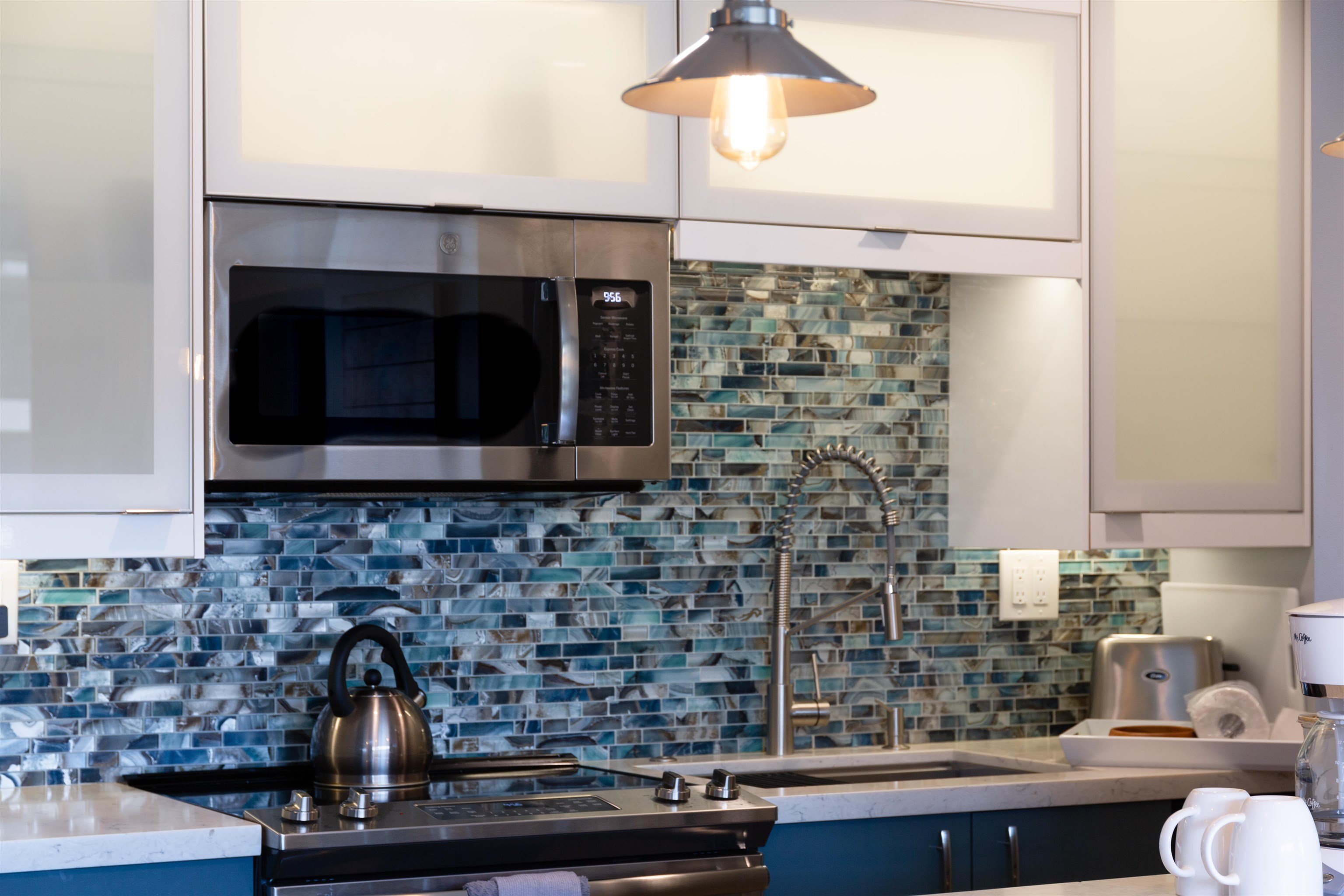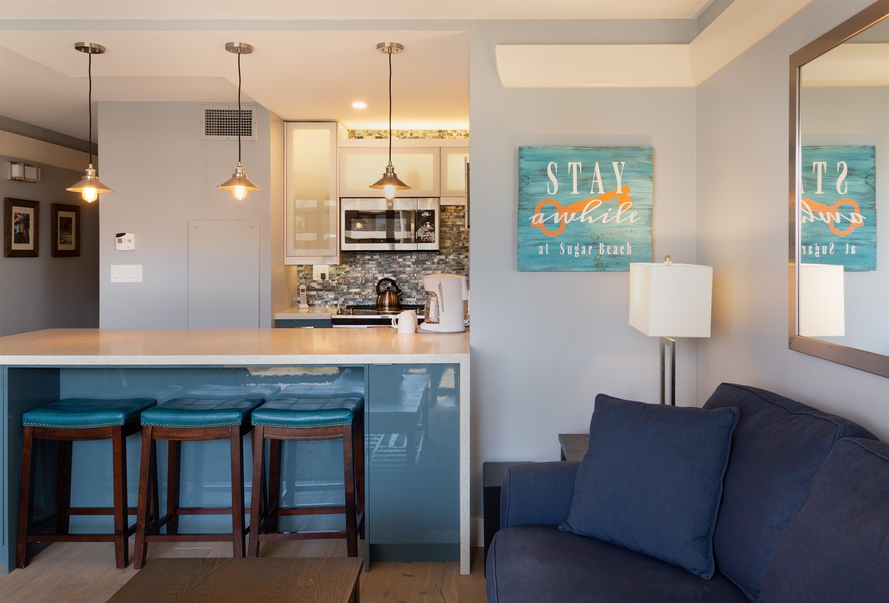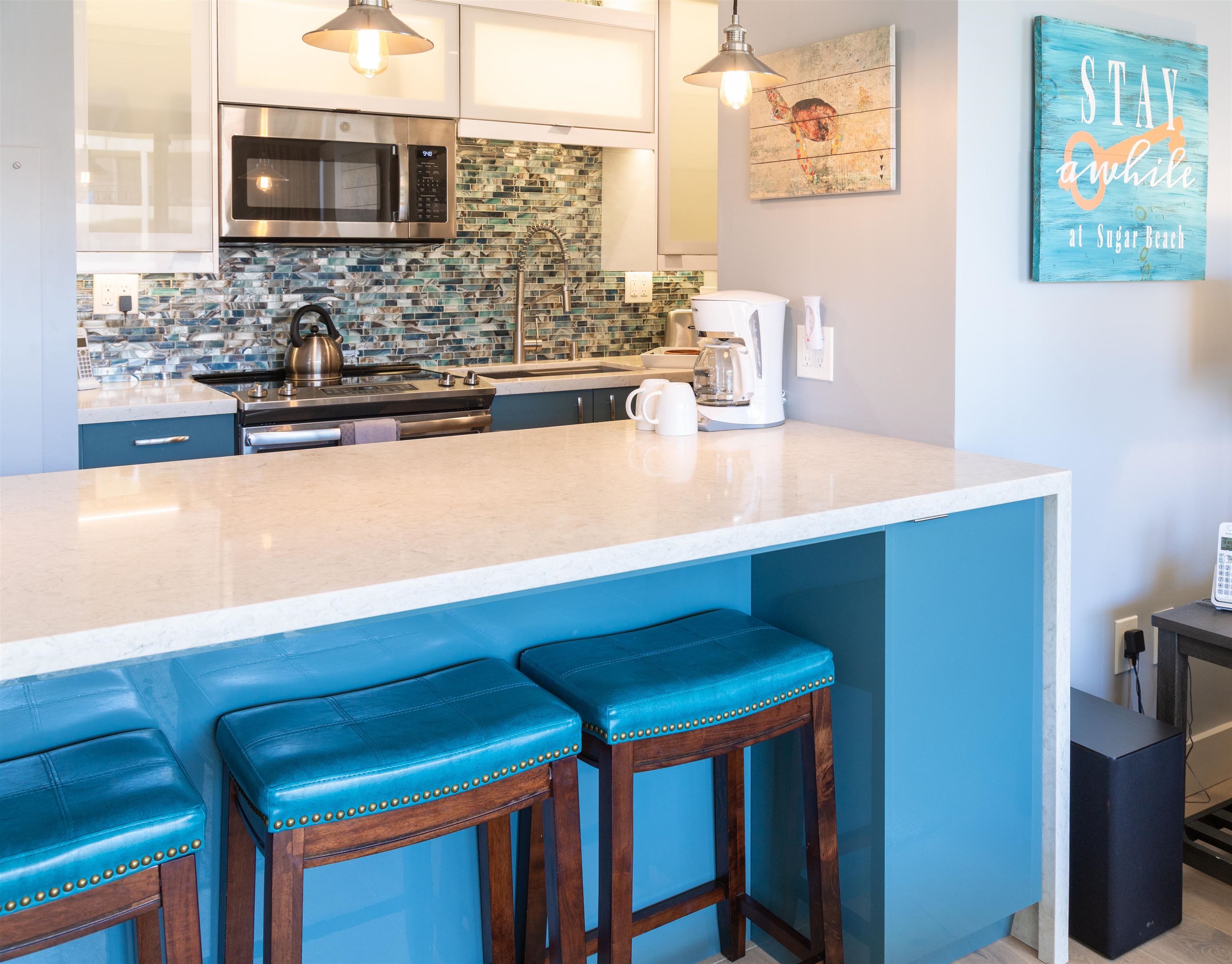 On the beach......you have a top end remodel and a heavily booked condo with a oceanview! What's not to like? Kitchen: All new GE Profile appliances. Stove and refrigerator are built in models. Quartz countertop with waterfall edge on peninsula. High end Ikea cabinets that have ocean blue thermfoil fronts. Upper cabinets are opaque white glass fronts and have interior cabinet lighting. Under mount and top mount lighting has been installed to light the condo with indirect lighting at night or used for task lighting. Three matching blue upholstered stools for peninsula. Living Area: LG 65” 4K TV with LG sound bar and wireless subwoofer. Sound bar also allows a person to connect via BT to play music. Wall mounted entertainment center keeps the area looking clean and sleek. Wall mounted crown molding is mounted below ceiling by around 8” to 10” to allow LED indirect lighting to light the hallway and living room space. This lighting as well as all other direct lighting are on dimmers. Wood woven blinds for the patio door and glass windows have been installed to replace the draperies. Bedroom: Ceiling fan has light and both light and fan are controlled by a remote. Hunter Douglas plantation shutters installed for room darkening and privacy. Bathroom: Rpl. Electrical Panel, All floor and shower area wall tile are large format except the accent strip down the center of the shower. The tile behind the vanity is a blue glass tile that was installed in a vertical subway pattern to give an abstract appearance of a waterfall. The bathroom vanity is a custom vanity made from African Mahogany. Toto Washlet toilet includes powered toilet seat that provides bidet features, warming seat and auto lift toilet seat. The vanity medicine cabinet is a Robern 30”x30” AIO Lighted Cabinet with BT. The cabinet has lighted mirrors and all mirrored interior with power inside the cabinet. All Utilities are covered in the Maintenance fee including, Elect. Water, Sewer, Garbage, Cable TV, Long Distance Phone, Internet and Wi-Fi.