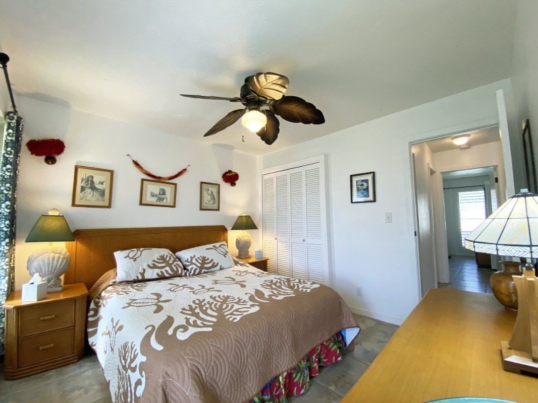 The condo features tile floors throughout, front to back trades flowing through, new windows, new sliding door to the back lanai, half bath ensuite in the main bedroom, Makai-side facing guest bedroom, eat-in kitchen table for 2. Sold furnished as shown and as-is.