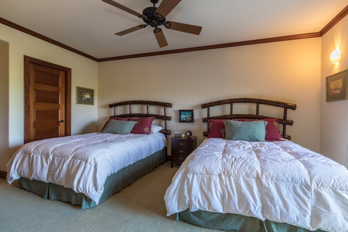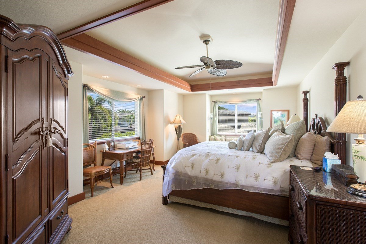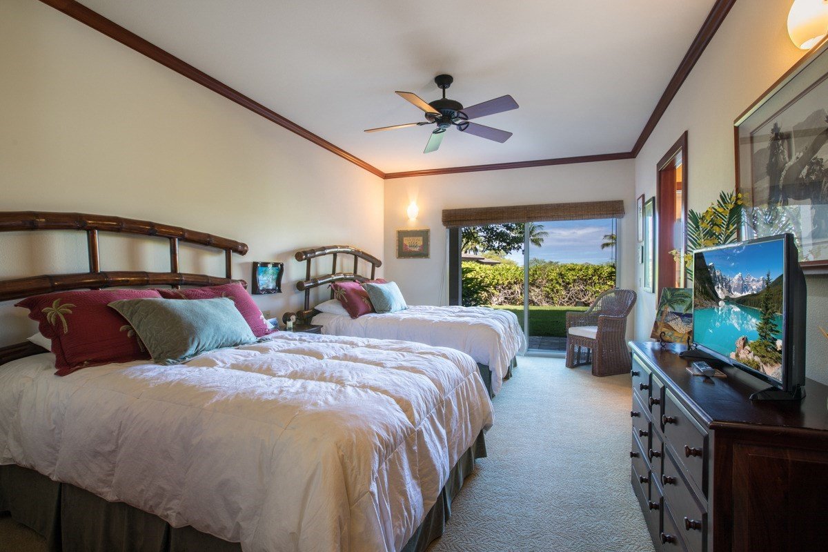 The Maile floor plan with it's split level entry offers an upper level primary living area with great room, kitchen, master bedroom and bath, large covered lanai and powder room. The upper level covered lanai is equipped with an outdoor kitchen and provides views to the ocean, sunsets and beyond. The lower level with it's generous guest master bedroom and bathroom must be seen to be appreciated. The large lower level third bedroom accommodates two queen beds. Both lower level bedrooms provide walk-in closets, private en suite bathrooms and private covered lanais.