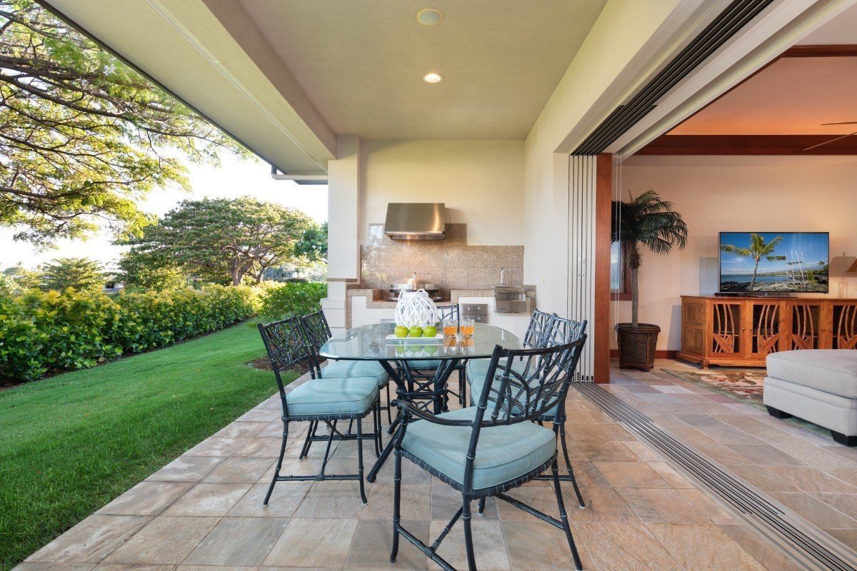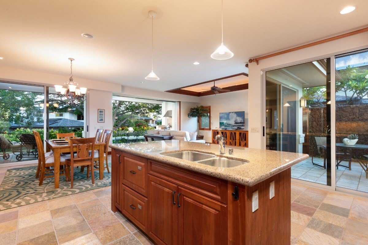 Make this rarely used Lehua model at 2,174 s.f. with 3 bedroom and 3.5 baths your very own slice of paradise. It's in move-in condition and never been vacation rented. This home boasts beautiful finishes such as solid mahogany doors, granite countertops & backsplash, and natural stone flooring. Plan your dinner parties in the gourmet kitchen which includes a Sub Zero refrigerator and Wolf oven, microwave and cooktop. Have your family and guests join in conversation on the large center island breakfast bar in the kitchen. Walk through the generous living room and eat outside on the covered lanai that features an outdoor stainless steel cooktop and prep sink. Enjoy the upstairs master suite with walk-in closet and built-ins, along with a separate covered lanai. The Master Bathroom has dual sinks, separate shower, cast iron tub and skylights. Furniture per Inventory List.