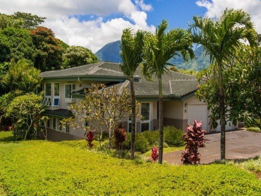 This perfectly maintained, fully furnished townhouse is a successful vacation rental and feels like a private jungle hideaway. It has the best location in the complex, being an end unit with views of the Robert Trent Jones Jr designed golf course and lush jungle. It is extremely private with abundant birdsong and a peek of the mountains from the upper lanai. Just steps away, enjoy the heated pool, community BBQ and party pavilion. This floorpan offers 2 master suites, one up and one down with a third smaller bedroom and detached bath. Offering tropical furnishings, beautiful bamboo floors and a fully stocked kitchen, it is move in ready for your discerning buyer. You can walk to shopping, dining, beaches, golf, St Regis Hotel and more on the dedicated pedestrian paths throughout the Princeville Resort. It is a 5 minute drive to the quaint village of Hanalei with its miles of sandy beach, breathtaking views of the waterfalls on Mt Namolokama, many surf spots, Hanalei Pier, restaurants and shops. Another 15 minutes beyond takes you to the amazing snorkeling beaches of Ha'ena and the Na Pali Coast trailhead. If you head the other direction you will find the Kilauea Lighthouse and Wildlife Refuge. Kaua'i north shore...epic location!