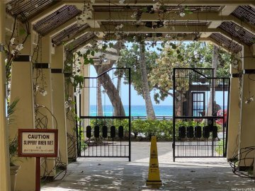 Waikiki Beach Tower, a condo hotel allowing short-term vacation rentals, is the tallest building in Honolulu for its small lot size, located on Kalakaua Ave across from Kuhio Beach, set back 150 ft for privacy, with access via a scenic walking path from Kalakaua Ave or Liliuokalani Ave (on leased neighboring land) and a parti