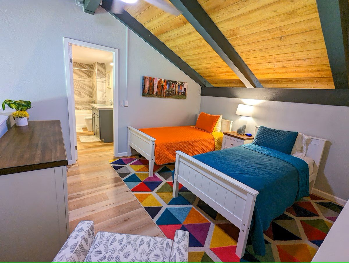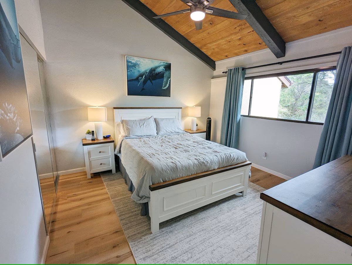 Each bedroom has private access to a separate bathroom. The master bedroom has a king-size bed, vaulted ceiling, an expansive bathroom with a large walk in shower, high volume ceiling fan, and personal access to lanai. The front bedroom has a queen bed, large sliding mirror closet doors, vaulted ceiling, high volume ceiling fan, and private access to a separate bathroom. The loft bedroom has two twin beds (which can be converted to a king size bed with provided "King Maker" kit for added comfort), vaulted ceiling, high volume ceiling fan, and its own updated personal bathroom and large closet.