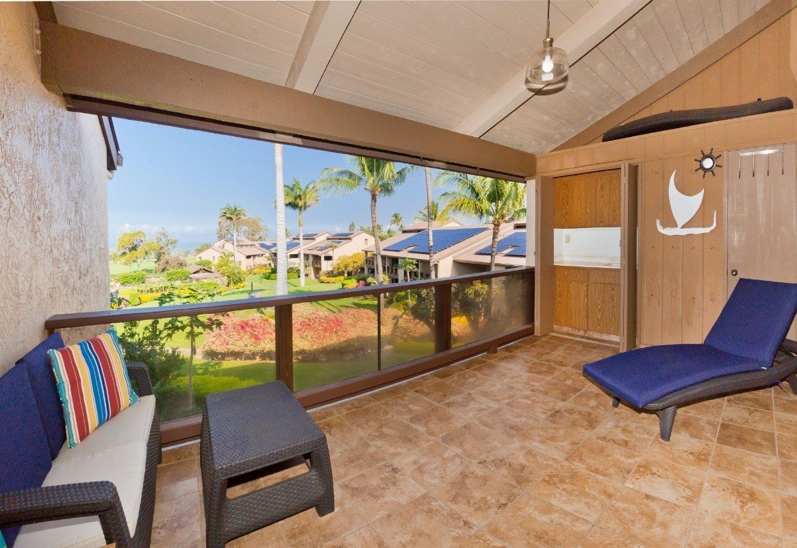 End your day with beautiful horizon sunset views from the spacious lanai overlooking the golf course. Lanai also equipped with a wet bar and extra storage. Upstairs unit, split level & fully furnished 2-bedroom 2-full bath condo with vaulted ceilings. Master bedroom and 1 full bath upstairs, second bedroom and full bath on main floor. Dining area opens to living area perfect for hosting. Lots of storage throughout the unit. 1 unassigned parking stall available. Walking distance to golf course (discounted golf), tennis courts, pickleball court, community pool with new designated kids area, grocery store, some dining, a community book exchange mobile and a car wash area. Also driving distance to some of the best beaches, shops, and more dining. STVR capable, must apply for permit.