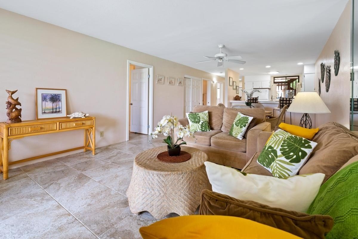 With large glass sliding doors in the living room and primary bedroom, the home is filled with natural light, gentle breezes, and allows for indoor/outdoor living. Enjoy peaceful views of the lush landscaping, golf course & ocean views from your spacious lanai. The lanai is the perfect outdoor entertaining area or for enjoying the serene and tranquil surroundings. A ground floor condo with a great floor plan of 1,231 sqft of living area featuring two bedrooms and two full bathrooms and has no stairs to the condo.