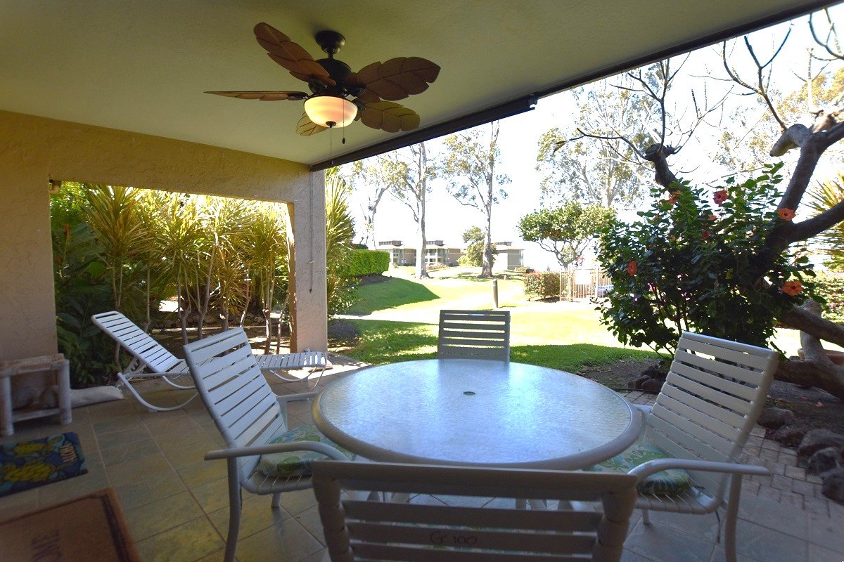 Discover serenity at this single-story ground floor condo nestled in Waikoloa Villas, offering views of the ocean and the Waikoloa Village golf course. Relax on the oversized lanai amidst lush tropical grounds, where wild turkeys roam and vibrant sunsets illuminate the sky. The lanai is the perfect spot for enjoying your morning coffee or evening cocktails. This condo is just a few steps away from one of the two inviting pools. Waikoloa Villas features two swimming pools, spas, cabanas, outdoor kitchens and BBQ areas for your enjoyment.