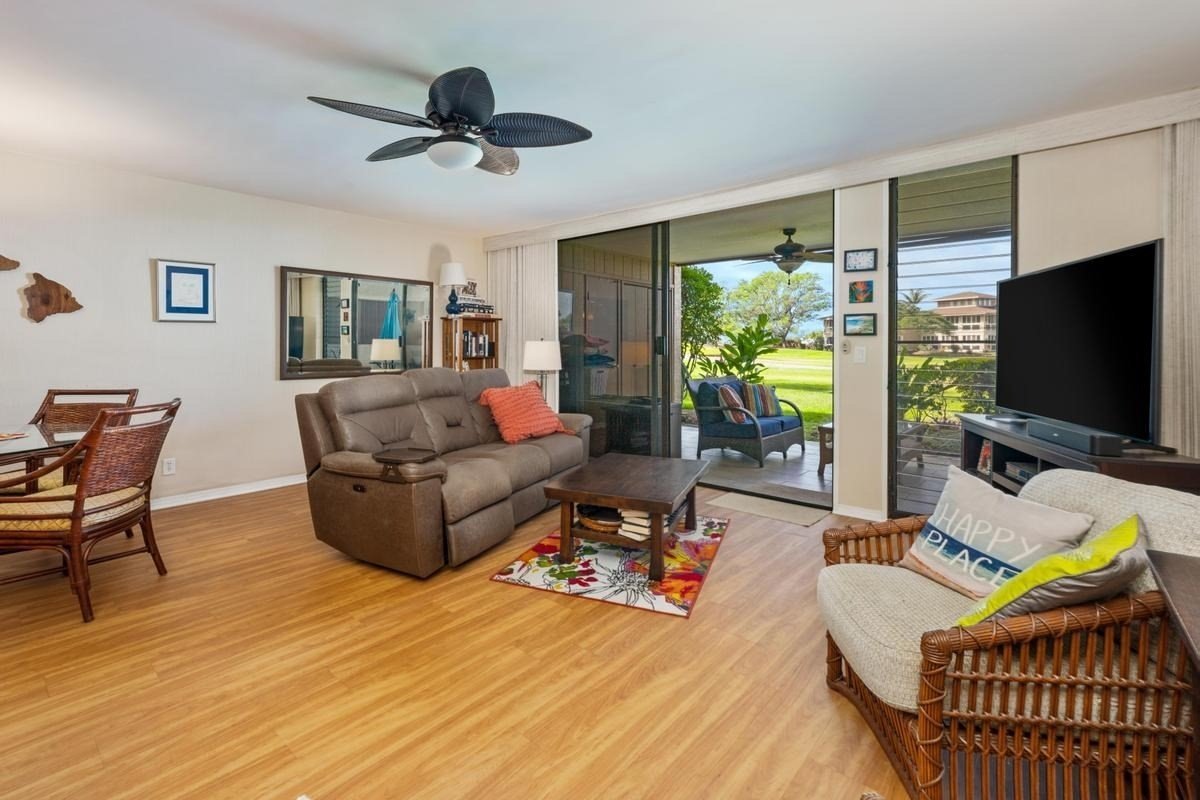 Great location right on the 9th green of the golf course, this 1 bedroom, 1 bath condo is furnished and ready to be owned by someone new! Flooring has been replaced and a few other improvements done recently. The view includes the ocean! Great location in this neighborhood. A lovely place with 2 swimming pools & spas and 2 BBQ areas and near the pro shop, clubhouse, driving range, 2 tennis courts and a heated neighborhood pool. A new Waikoloa Plaza area is partially complete with new businesses and restaurants. Totally turnkey furnished.