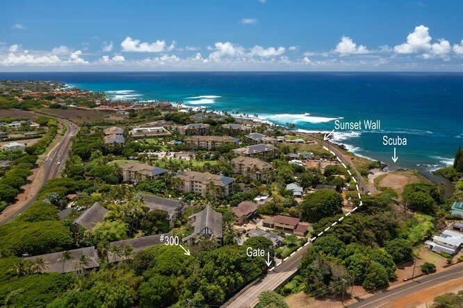Located at the Heart of Poipu, Waikomo Stream Villas is known for its Lush Tropical Landscape including Meandering Streams filled with colorful KOI, pounding waterfall, and a BBQ Pavilion alongside the Waikomo Stream. #300, a highly sought after ground floor end-unit location, consisting of a spacious single level 1-bed/1-bath with 3 extra (floor to ceiling height) windows. This corner unit faces a large grassy lawn with direct access to the gate that leads to the Koloa Landing "oceanfront wall" for daily Sunset watching! Currently used as a vacation rental, this condo is sold turnkey (furnished). Showings will be subject to vacation rental occupancy, so be sure to view the 360 Tour linked at the top of the listing. Original improvements have been well maintained and are ready for you to personalize your space. This is a very busy vacation rental managed by Parrish Collection.