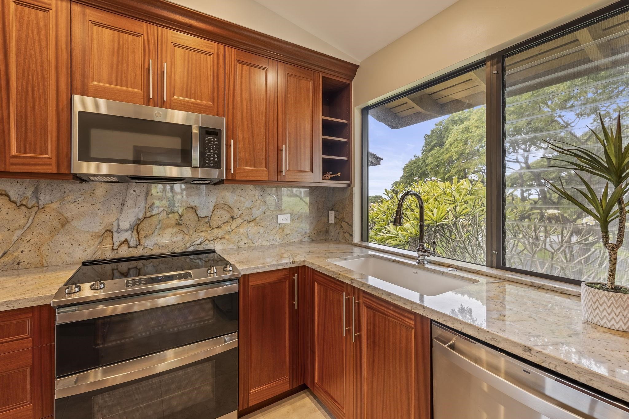 Immerse yourself in the allure of Wailea Ekahi with this stunningly remodeled one-bedroom, two-bathroom condo, freshly completed in 2023. Every detail of this unit has been meticulously upgraded to offer a truly luxurious living experience. All while being the most affordable condominium unit in Wailea in an oceanfront complex that allows short term rentals. As you step through the entrance, natural light floods the space, illuminating the vaulted ceilings and open-concept kitchen. Revel in the beauty of new Sapele wood cabinets, modern appliances, and sleek granite countertops. Gaze out the window by the kitchen sink to enjoy your ocean view. The expansive great room seamlessly merges dining and living areas, boasting brand-new split AC and access to a tree top lanai with a gorgeous ocean view. The second bathroom has been tastefully modernized with a walk-in shower and a Sapele wood vanity complemented by granite countertops. Retreat to the generously sized bedroom with a bright and spacious study/bonus room surrounded by lush tropical foliage. The adjoining bathroom boasts a bathtub, matching custom Sapele wood vanity, and granite countertop. Wailea Ekahi offers an array of exceptional amenities, including four pools—one mere steps from the beach—and a stunning beach pavilion. Amidst the complex's tropical gardens and expansive grassy areas, discover convenient BBQ stations and a pickleball court for enthusiasts. Cherished by full-time residents, part-time dwellers, and vacationers alike, Wailea Ekahi is a sought-after community, making this unit an ideal second home or lucrative investment property for short-term rentals. With no prior vacation rental history, this impeccably upgraded condo presents a must-see opportunity to fully appreciate its extensive renovations and unrivaled charm.