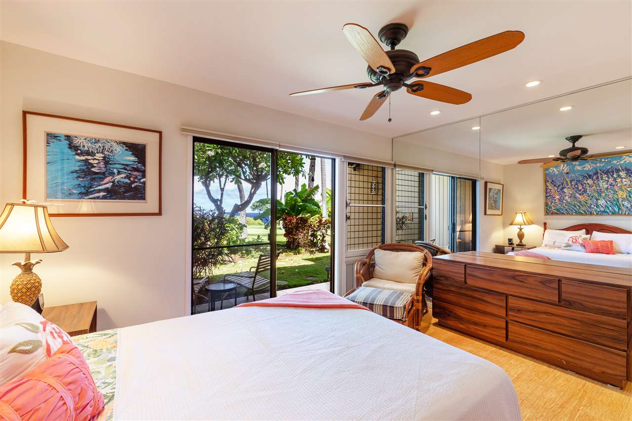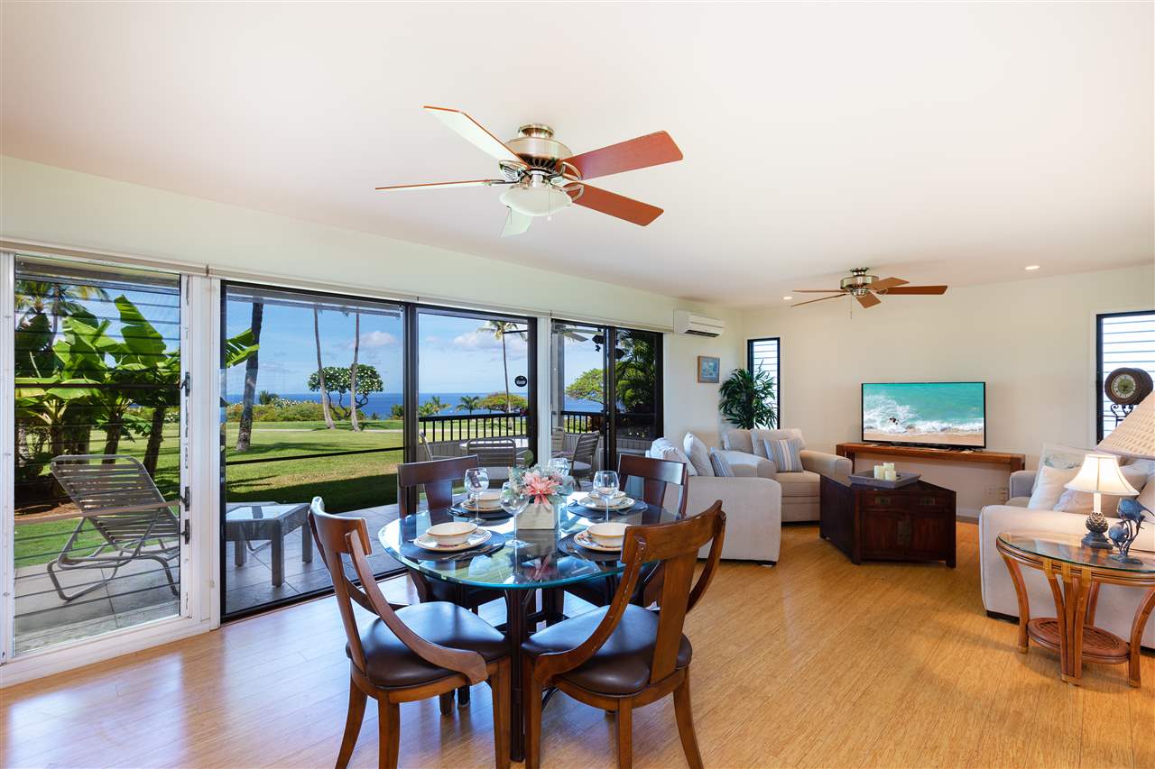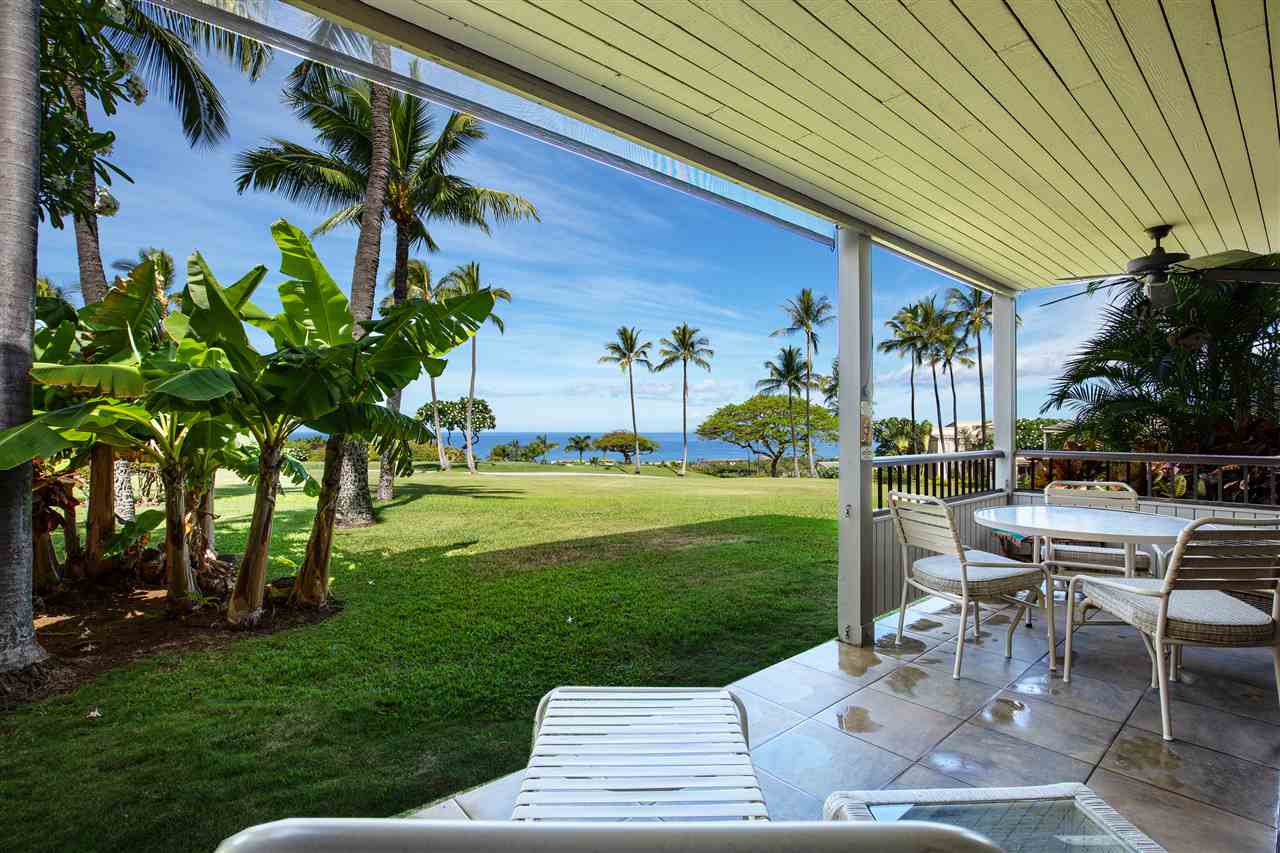 Very rarely available in the premier front row building #15! Breathtaking Ocean and Fairway Views! This ground floor unit is situated just above the 11th fairway of the Wailea Blue Course. The living room and master bedroom have private lanais that step out to a relaxing open lawn with panoramic ocean views. Features include split system AC in the living, bamboo floors throughout, brand new tile in the master bathroom, granite counter tops, and cherry cabinets. Tastefully decorated providing everything you will need to move in or vacation rental. Never been rented. Pets allowed and close proximity to the pool. Fully furnished and turn-key. Don’t forget to check out the video of the view.