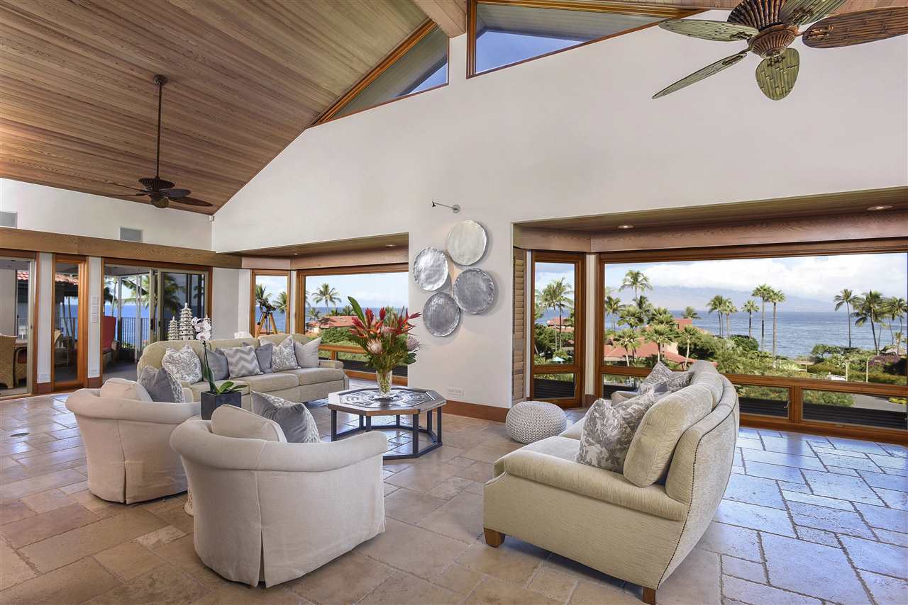 Wake up in this prestigious & coveted Wailea Point 4-bedroom, 6-bath, ocean-view residence! Artisan-quality stone, custom tile & warm hardwoods are used throughout the 2-level, spacious, double-condo. Recently renovated, enjoy unparalleled luxury in 4,821 SF of air-conditioned living space, plus an additional 1,472 sf on six covered lanais! This home is perfect for large gatherings & entertaining. Using the finest materials, each unique room offers views & vistas that delight: indoor & outdoor dining, a granite-countertop kitchen with quality appliances, coffered lighting, a sculptural wood staircase, wet bar, office, media room, & two custom garage units. Gaze over manicured, lush, tropical flora towards commanding views & sweeping Wailea sunsets. Perched on one of the most beautiful promontories on Maui, this oceanfront, 24-hour-gated residential community on 28 acres, boasts 2 heated pools, a fitness center, entertainment pavilion, pickleball court, tennis court, boat garages & gated beach access. Nearby are the Wailea Tennis Club & famed Wailea Golf courses. Enjoy white sandy beaches, ocean activities & the magnificent “Wailea Walk” leading you to elegant resorts, spas, fine dining & shopping.
