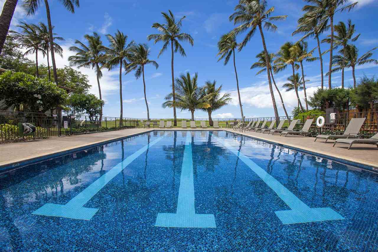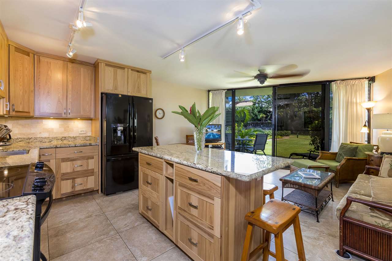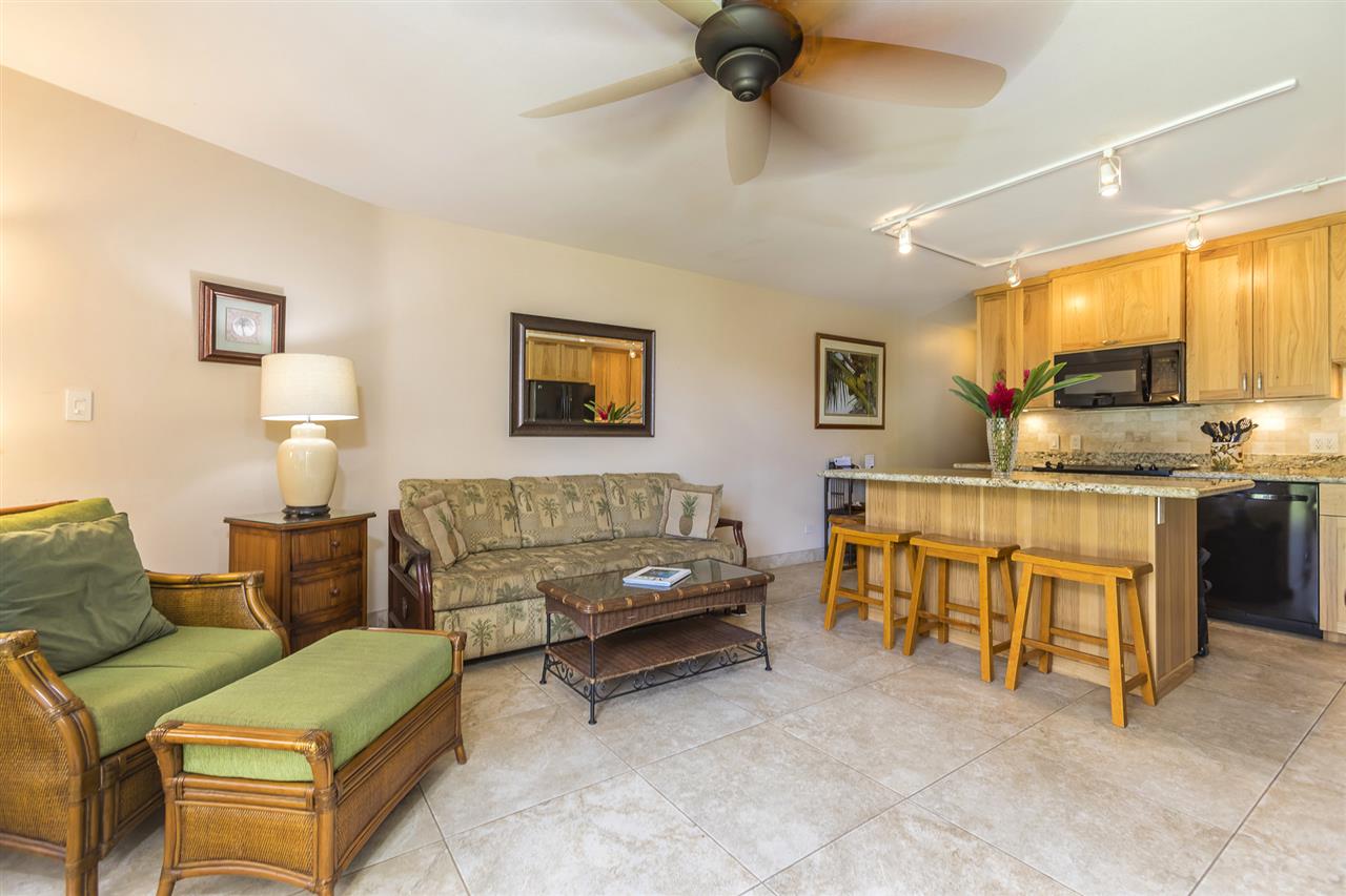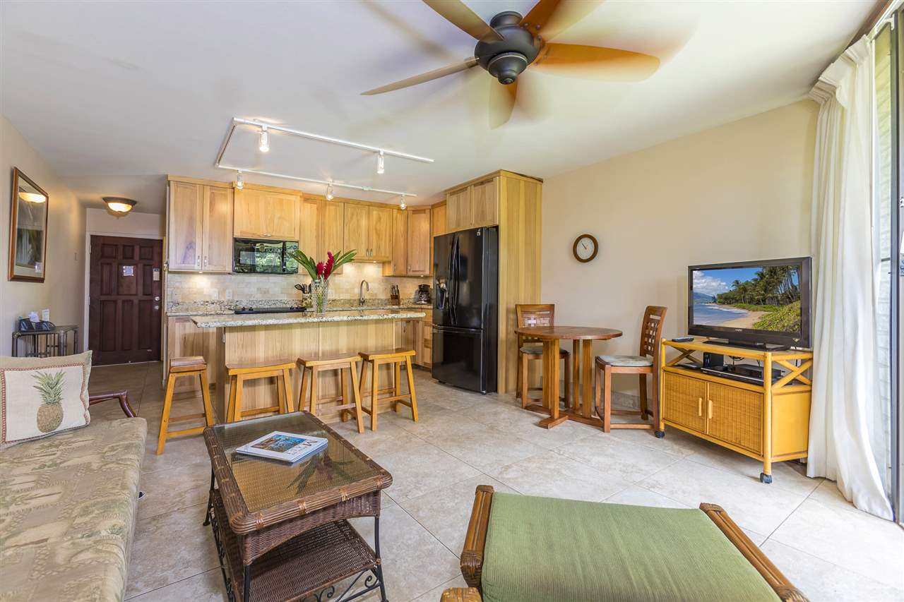 You will enjoy this tastefully RENOVATED & Nicely Furnished one bedroom, one bath ground floor unit at this unique, low-rise, peaceful, South Maui Beachfront complex. Located on the beach & tucked away from the hub-bub & traffic of South Kihei Rd., Waiohuli Beach Hale is a very well kept secret & boasts gorgeous common elements including a large tiled pool, a lushly planted tropical central courtyard, multiple beach-facing BBQ’s & shuffleboard court. The unit has been lovingly updated & features smooth ceilings, travertine-like tiled floors, specimen granite counters in the kitchen & bathroom, Hickory wood cabinetry, a subway-tiled travertine kitchen back-splash, an eat-in island kitchen counter, black appliances, along with Halogen art lighting.The glass-walled shower is tiled, floor to ceiling, & has a black river-stone base. There is sweet, cool, air-conditioning! Key-lock the lanai slider & you are just steps to the pool yet far enough away to enjoy the peace & solitude of this special environment. Waiohuli Beach Hale is a revered location for ocean enthusiasts who love to kayak, stand-up paddle board, surf, kite-board or simply swim & stroll this lovely beachfront! Spas, golf, tennis & world-class shopping & dining are nearby! Walk or bike to Kihei’s Azeka Shopping Complex where you will find a plethora of restaurants, banks, a post office, the Powerhouse Gym, an ACE hardware store, & lots of music & night-life! Enjoy the Best of All Worlds! A South Maui treasure that is a Must Experience.