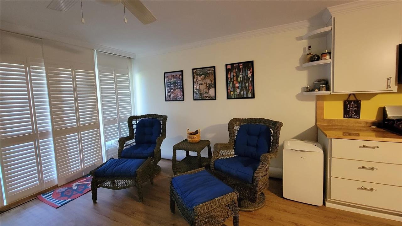 Recent total remodel. Ground floor with ocean and garden views. Life Loc vinyl floors, plantation shutters, custom built-in wall cabinetry, includes queen wall bed, desk, pantry and dining table. Kitchen custom white cabinets, farmhouse stainless sink and stainless appliances. Vinyl sliding doors lead to tiled lanai with storage. Updated bath with custom glass block shower. Shutters also in bedroom. Design details makes the spaces wide open and inviting. Pool, BBQ, tennis courts and complex is right on the ocean.