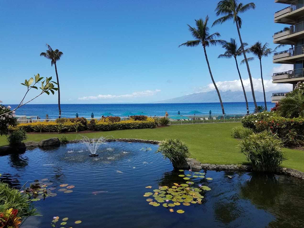 The 2 towers inside this gated community are both beachfront, less than 40 feet from Kaanapali Beach.