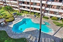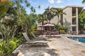 White Sands Village is directly across the street from Magic Sand Beach Park, the closest building only about 50 yards from the water’s edge. Two of the rectangular buildings are perpendicular to Alii Dr, with a courtyard between them, and the third building behind against the hillside.