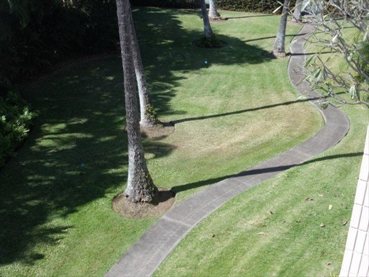 White Sands Village is directly across the street from Magic Sand Beach Park, the closest building only about 50 yards from the water’s edge. Two of the rectangular buildings are perpendicular to Alii Dr, with a courtyard between them, and the third building behind against the hillside.